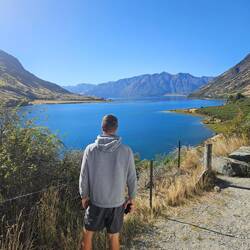 Auf dem Weg in die Berge, legten wir noch eine Pause am Lake Tekapo ein. Für starke acht Dollar, konnte man sich die Erlaubnis erkaufen, auf einen Berg zu fahren. Von dort hatte man eine unglaubliche Aussicht auf die Umgebung und den tiefblauen See. Außerdem gab's oben ein kleines Café und dementsprechend viele Menschen, die Schlange standen, um auf einen Felsen zu klettern und sich dort in den spannendsten Posen ablichten zu lassen.
