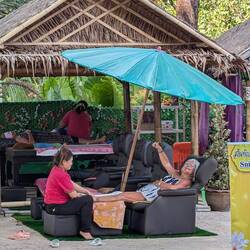 Der morgen beginnt wie immer mit einem leckeren Frühstück. Danach hatte Joschi einen Termin beim Friseur .. heute mal nicht in Takuapa sondern hier in Khaolak... Witzig war die Art des Haarewaschen hierbei 😂😂 hierzu musste er auf einer Liege Platz nehmen, bekam einen Schutz um und die Haare konnten nun gewaschen werden.. Sehr ungewöhnlich.. aber 😁😁😁 Ergebnis war sehr gut und das alles für 300 Bath .. das sind nicht mal 10 Euro 💶... Ich war natürlich nicht, ich komme dann wieder zu dir Undine 😎😃 kannst schon mal einen Termin machen 😂😂😂😂