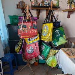 Zu guter letzt haben uns die Zwei noch eine kleine Schneiderei gezeigt, wo man aus Reissäcken tolle Taschen macht. Richtig cool. Und mit was für einem Equipment 😜. Jetzt war dann Schluss für heute. Wir haben es nicht mal geschafft, auswärts essen zu gehen. Also blieben wir im Resort und haben einen Tomatensalat und ein Sandwich gegessen. Dann ab ins Bett, da wir morgen früh nach Khao Sok wollen..
