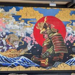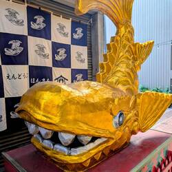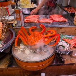Ich stromere ein bisschen rum, hab ja Zeit und es gibt viel zu sehen. Gegen 14h ist Ebbe, da kann man trockenen Fusses durch das beeindruckende Tor laufen. Vorher gönne ich mir aber noch ein Edelsushi. Jedes Teilchen wird separt zubereitet und serviert. Am Anfang gibt es eine gegrillte Auster, dann warme und kalte Nigiri mit unterschiedlichem Fisch und Geschmack. Zum Abschluss ein Schälchen Suppe mit Muscheln. Das war lecker!