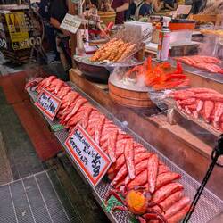 Eine Empfehlung für preiswertes Sushi in jeder Stadt war KURA SUSHI. Hier wäre ich fast schon am Einlassautomaten gescheitert 😂 Aber ein junger Japaner half mir über die erste Hürde: noch vor der Tür muss man die Anzahl der Gäste eingeben und erhält dann ein Ticket mit der Platznummer. Ich ging also auf Platz Nr. 57. Die Gäste sitzen in Reihen alle nebeneinander. Rechts und links eine Glassscheibe, davor ein Fliessband und ein Display. Dort wurde ich ermutigt, den QR-Code zu scannen und mittels Handy zu bestellen. Vor mir war ein Getränkehahn für warmes Wasser und rechts ein Tablett mit Stäbchen, Soyasosse, Ingwer, Wasabi...