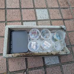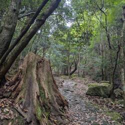 Ich machte mir Frühstück und allmählich verzogen sich die Wolken und es wurde gleich wieder heiss. Nachdem ich den Cache hier noch eingesammelt hatte, begann ich den Abstieg vom Mt. Misen über die Ohmoto-Route. Sie verlief etwas weiter links, über Stufen und kleine Wege. Ich war heilfroh, dass ich die Stöcke eingepackt hatte: die Stufen waren glitschig. Einmal hat es mich trotzdem entschärft, ist aber nichts passiert (ausser blauer Fleck am Po 😂).
