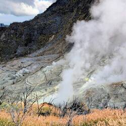 Der Fuji hatte sich nun mittlerweile hinter Wolken verschanzt, auch wenn ansonsten die Sonne schien. Ich schaute mir erstmal die sehr beeindruckenden thermischen Aktivitäten an: überall dampfte es und ein kleines Areal mit Gebäuden war ganz gelb und grau. Richtige Schwefelhäufchen waren zu sehen...