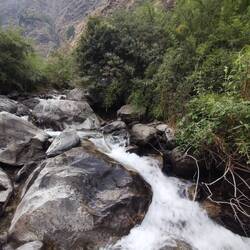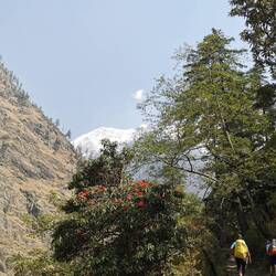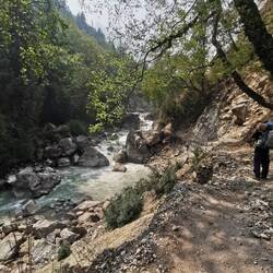 Ein Teil des Weges ist gesperrt. Dort geht eine Metallkonstruktion an der Felswand lang, die aber durch eine Steinlawine beschädigt wurde. Daher müssen wir runter bis zum Fluss, über 2 Behelfsbrücken und wieder den Berg hoch. Die Sonne scheint satt, aber wir laufen meist im Schatten von rot blühenden Rododendron - Bäumen.