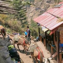 Wir treffen 4 Mönche auf dem Weg und eine Million Mulis, die ohne Gepäck von oben zurück kommen. Alle Güter werden mit ihnen transportiert, inkl. Wellblechplatten für die Dächer 😃