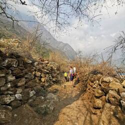 Nach dem Frühstück liefen wir los, weiter hinein ins Tsum Valley. Heute ist zwar nur eine kurze Tour mit 9km angesagt, aber es geht nur bergauf, meist über Stufen 😁