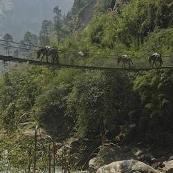 Als wir zu der Hängebrücke kommen, wird es deutlich voller. Die Franzosen (ca. 16 Leute + Träger und Guide) sind schnell eingeholt. Da wir nicht hinterher schleichen wollen (überholen geht bei den schmalen Wegen am Berg nicht), machen wir eine längere Pause am Fluss. Das Wasser rauscht so schön und der Anblick der Berge macht demütig.