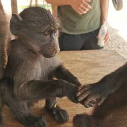 "frei" heisst aber nur, dass es keine zusätzlichen Arbeiten gibt, aber die Tiere müssen ja trotzdem versorgt werden. Also kann man sich für den Vor- u/o den Nachmittag in Freiwilligenlisten eintragen. Ich durfte heute früh nochmal die Äffchen mit Flasche füttern (alle 5 sind übrigens Waisen) und dann mit insgesamt 16 Affen zum Baboon Walk aufbrechen. Wir waren 4 Leute + Thomas. Die 5 Kleinen kamen ständig angeflitzt und wollten hoch bzw. kletterten gleich selbst auf den Arm. Manchmal sassen sie auf der Schulter, doch meist kuschelten sie sich an. Wenn es Stress mit den großen Affen gab, suchten sie Schutz bei uns. Das war so süss!