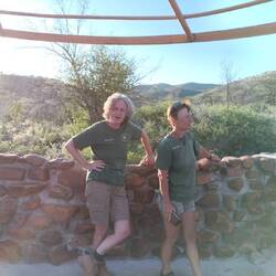 Unsere Vormittagsaufgabe nannte sich Carnivore Cage Cleaning. Wir bekamen Spaten , Besen, Eimer und Säcke und marschierten los. Nicht weit vom Camp sind die drei Gehege der Caracals. In allen sammelten wir alte Knochen und den Poop auf. Und dann mußten noch die Wasserstellen gereinigt werden: mit dem Spaten rundherum das Unkraut abstechen/schaben, den Pool ausschöpfen , mit dem Besen den Boden sauber schrubben und dann neues Wasser einlassen. Und das alles dreimal! Bei 35°C war das ziemlich schweißtreibend! 😅