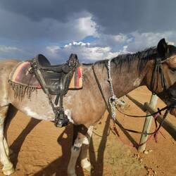 Der Höhepunkt des heutigen Tages sollte eigentlich ein Ausritt zum Sonnenuntergang sein. Die Pferde waren schon gesattelt, als ein kräftiges Gewitter aufzog. Die Pferde wurden total nervös und der Pferdeverantwortliche meinte, es wäre keine gute Idee, jetzt loszureiten. Wir sattelten wieder ab und liessen sie frei.