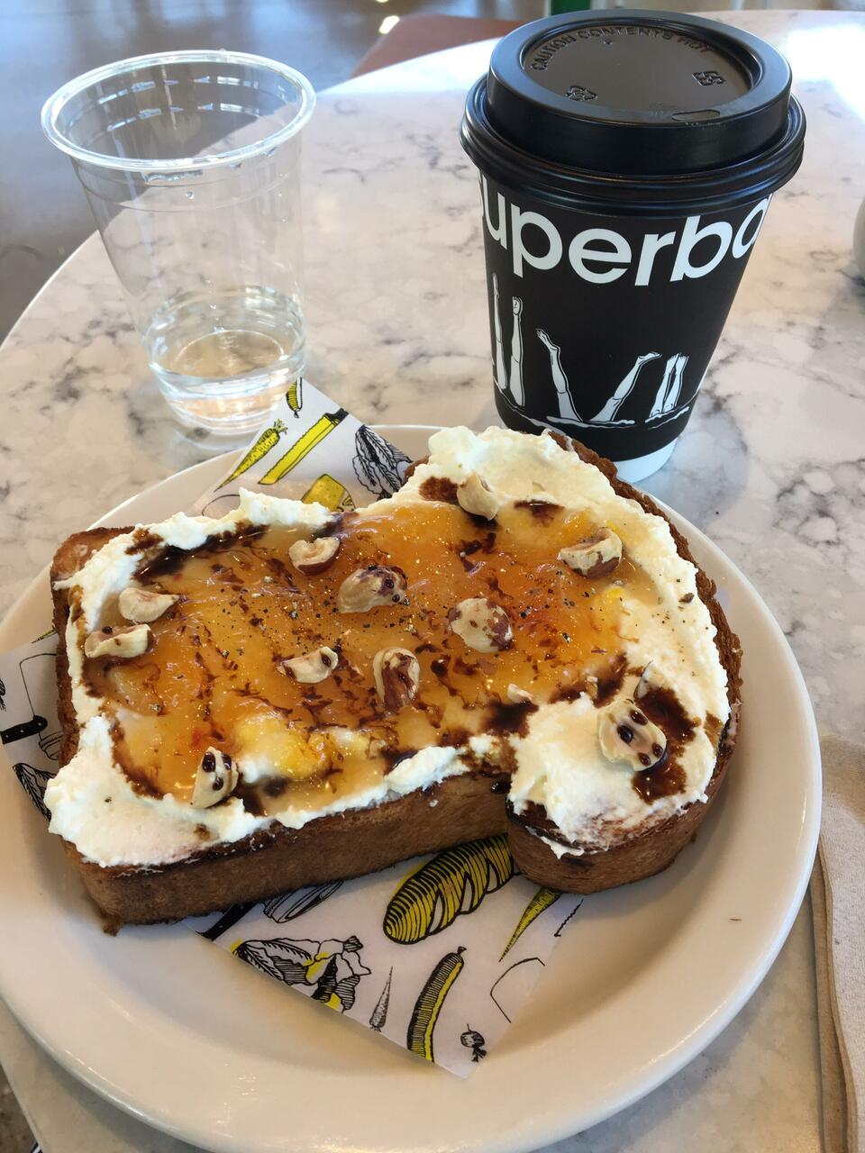 Ricotta toast with orange marmalade, hazelnuts and black pepper