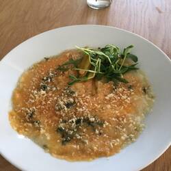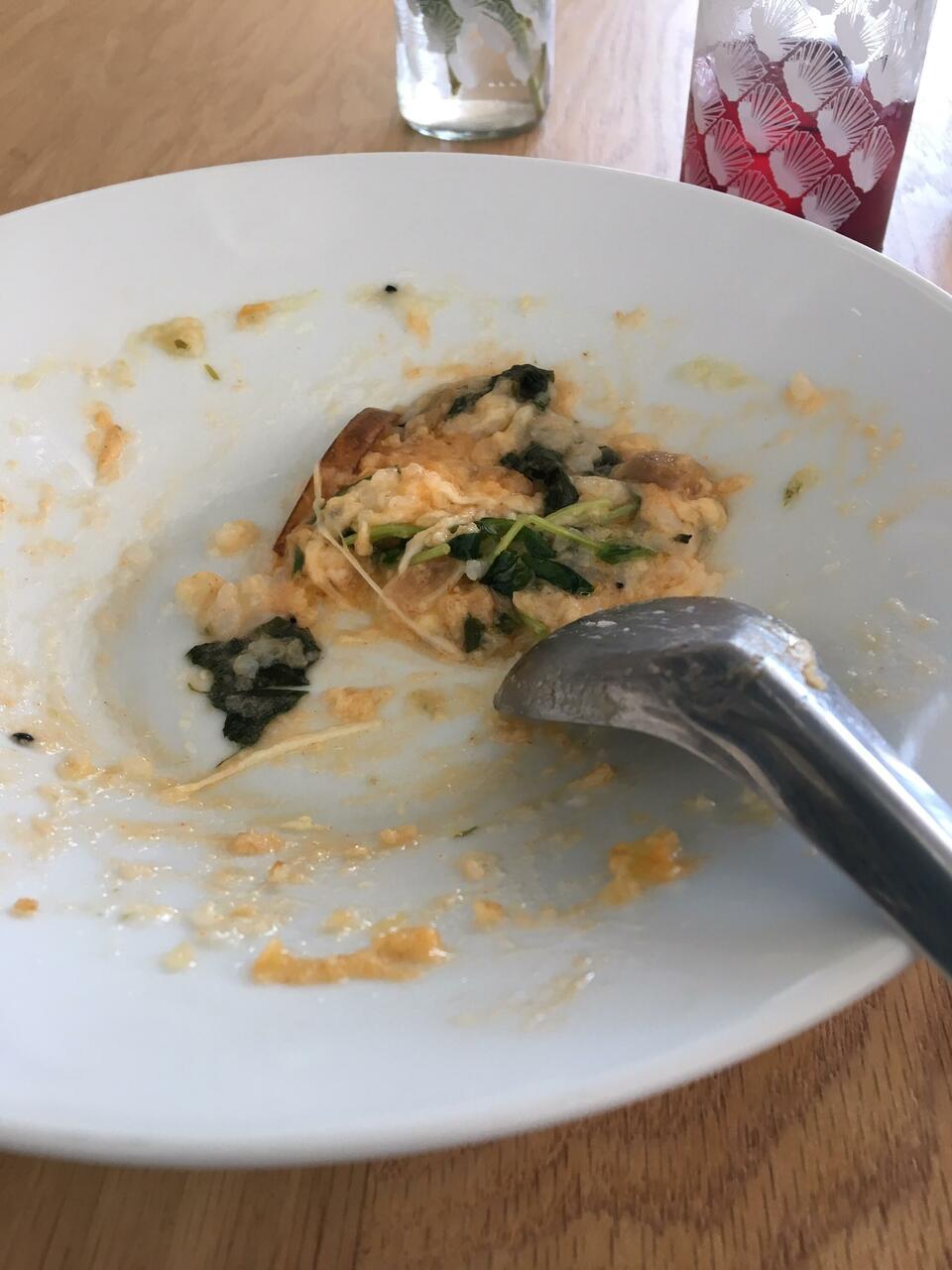 Dark greens porridge with some gochujang and cheese melted in top and apples and micro greens