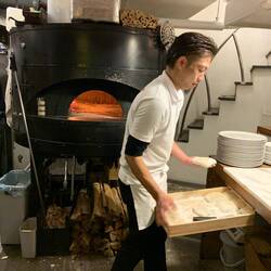 He presses the dough and after putting toppings he stretches it out on the wooden paddleRead more