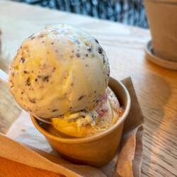 Olive oil ice cream - vanilla ice cream with chocolate chips, drizzled with olive oil, maldon salt. Ice cream didn’t have olive oil flavor
