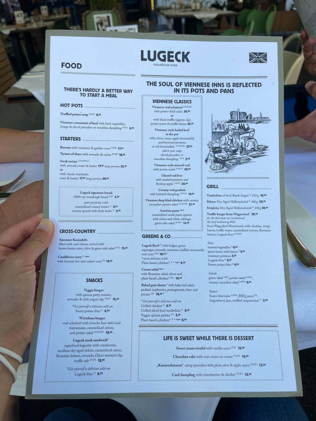 RestaurantsM LShow tripAdd to bucket listRemove from bucket listShareDay 3,145Saturday, September 7, 2024 at 12:41 PM ☀️ 28 °C Altitude: 192 m AustriaLugeck48.209785, 16.37504648°12’35” N 16°22’30” ELugeck September 7, 2024 in Austria ⋅ ☀️ 28 °C Truffle Wiener schnitzel with truffle butterBoiled beef. Potatoes with caraway seeds. Apple horseradish sauce. Egg mayonnaise Beer - lugeck special and the unfiltered beer below it 0 likes Show trip