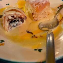 Yeast roll filled with a berry jam and covered in vanilla sauce