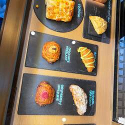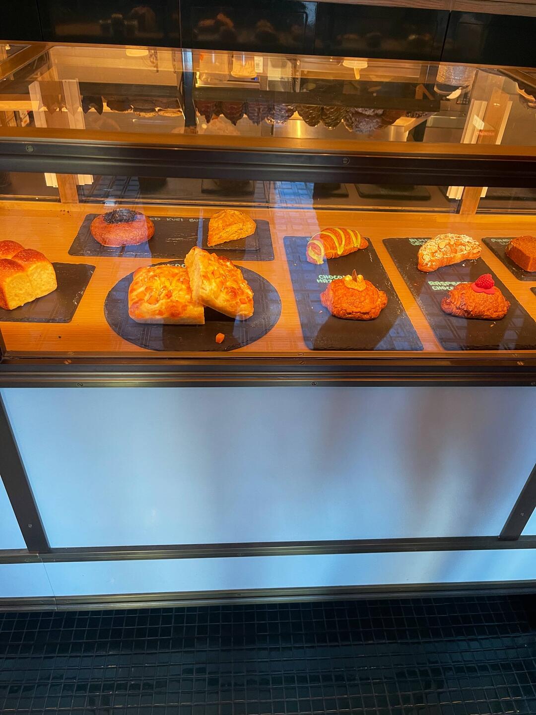 Bakery is good - chocolate hazelnut croissant, pistachio raspberry cookie, squash curry bun, almond croissant