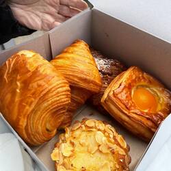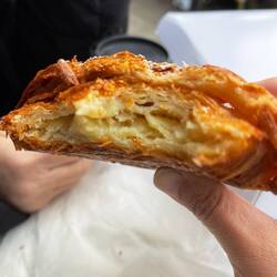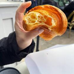 Top rated but soft croissant. Only a middle top was crunchy. Yellow dough so mom thinks there is egg.