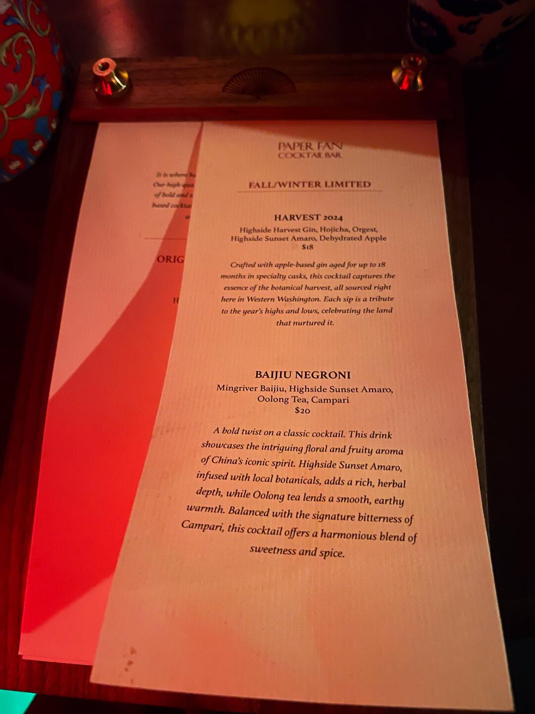 Asian inspired cocktails. Get Ming drink next time. East wind was sweet and floral. The dragon breath was like an old fashioned