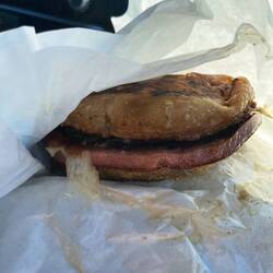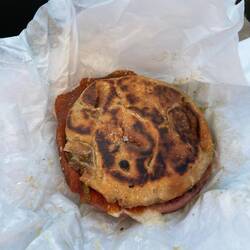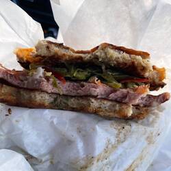 Fried mortadella and provolone with pickled peppers on olive focaccia