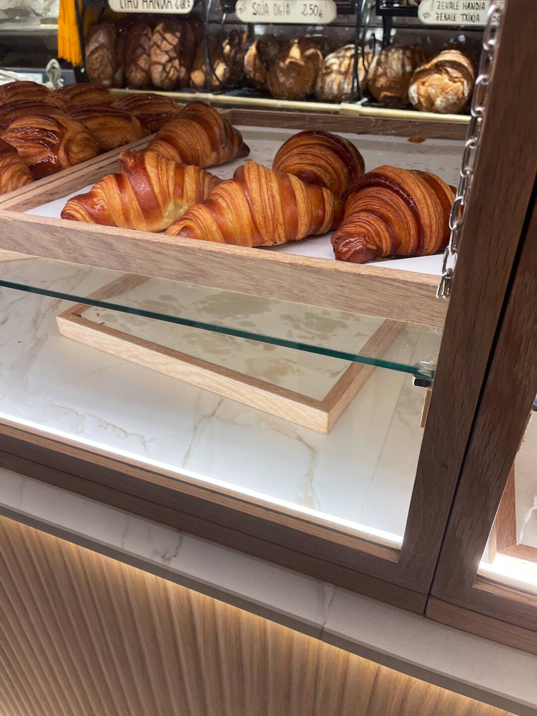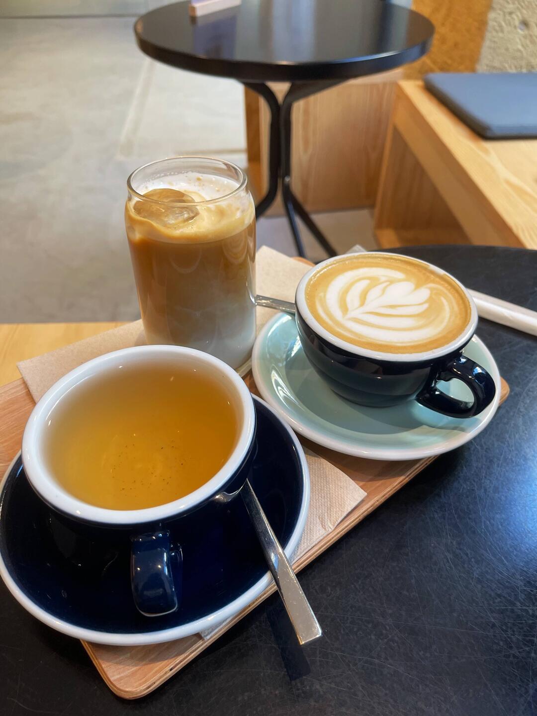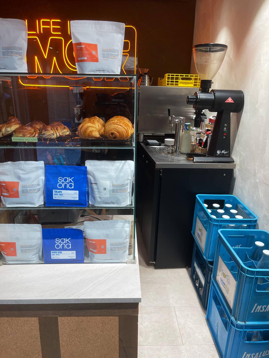 Tortilla with egg and caramelized onions. Cappuccino. Ham on baguette. Tuna salad sandwich with pickled peppers on baguette