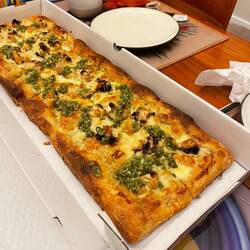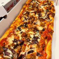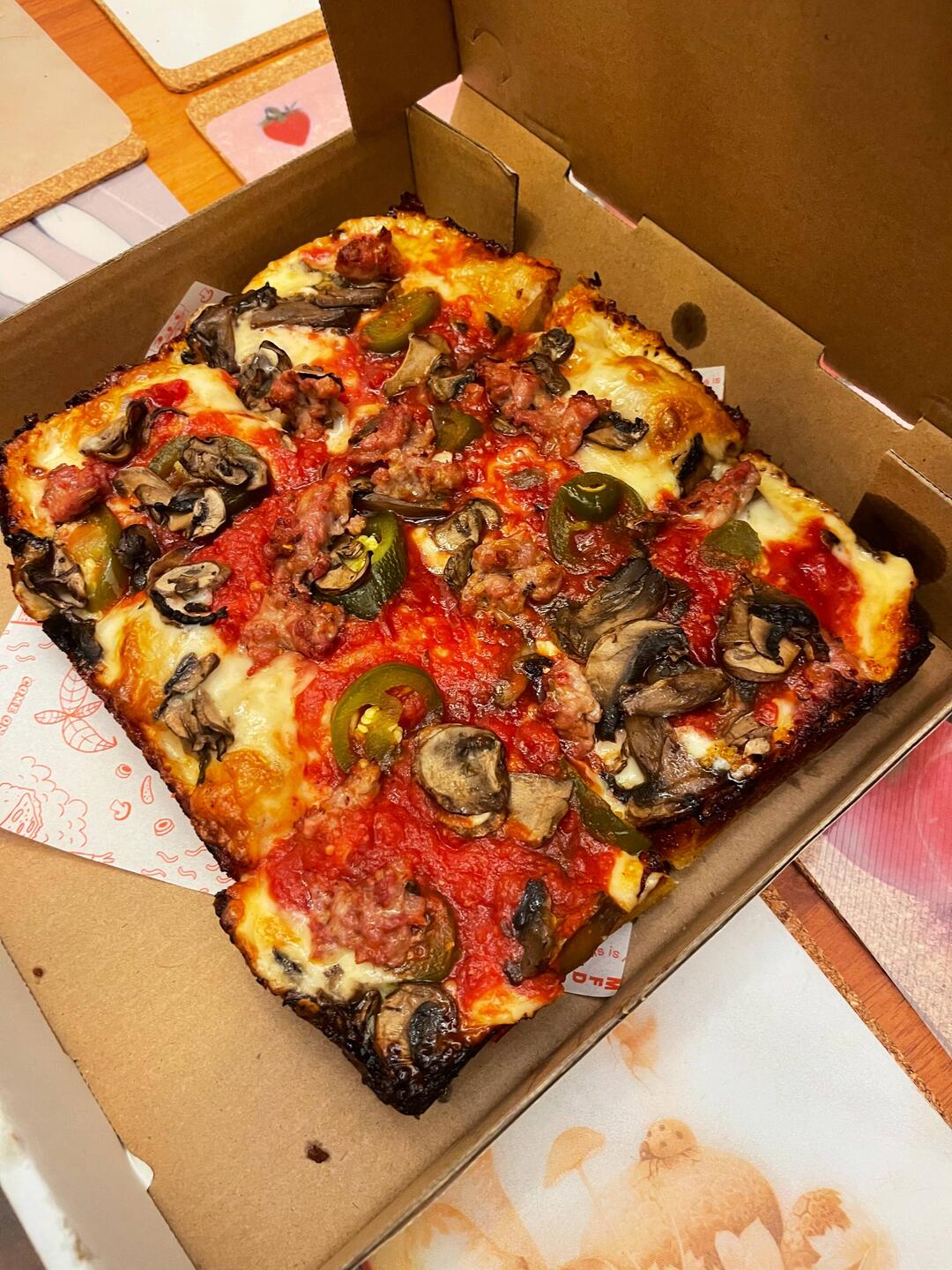 Custom pizza. Hot honey, fennel sausage, pickled jalapeños, mushrooms