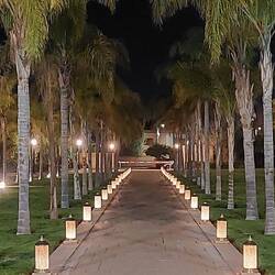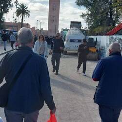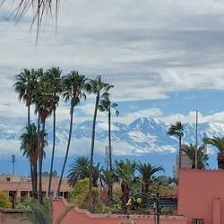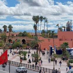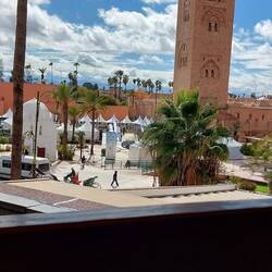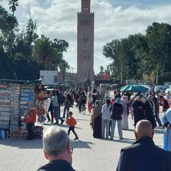 Unser Weg führte uns danach durch mehrere Parks, bis wir schließlich an der Koutoubia-Moschee ankamen. In einer Rooftop-Bar ließen wir uns nieder und genossen den Ausblick von oben: unter uns das rege Treiben des Platzes, im Hintergrund die schneebedeckten Gipfel des Atlasgebirge. Besonders spannend war der Blick auf den Startbereich des am Sonntag beginnenden Marrakesch-Marathons, der unten bereits vorbereitet wurde.