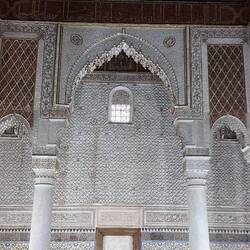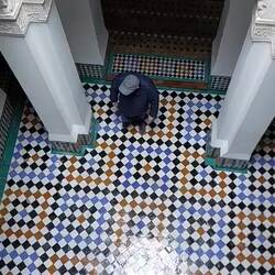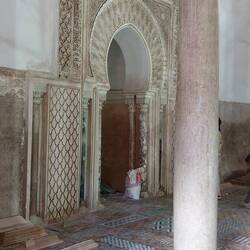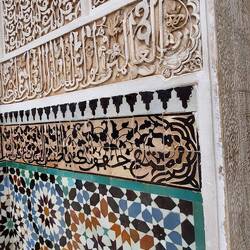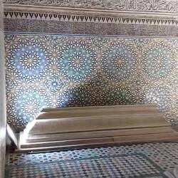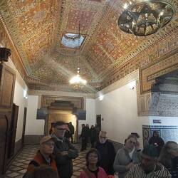 Anschließend ging es weiter zur Medersa Ben Youssef, einer ehemaligen Koranschule aus dem 16. Jahrhundert. Sie wurde aufwendig restauriert und begeistert mit kunstvollen Fliesen, filigranen Mosaiken und prachtvollen Zedernholzdecken. Die Ruhe dieses Ortes bildete einen schönen Kontrast zum Trubel der Stadt.