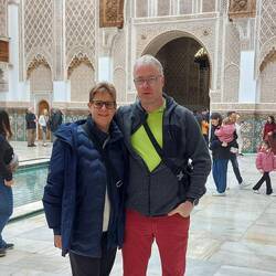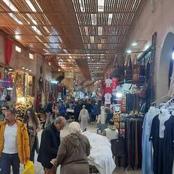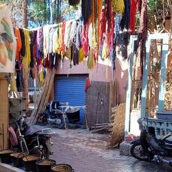 Wir schlenderten durch reges Treiben und farbenfrohe Geschäfte, immer wachsam, damit uns die Mopeds nicht über den Haufen fahren. Es ging durch den Lampensouk, weiter durch die Gerberviertel – fast alle Souks haben wir gesehen. Der Guide erzählte unterwegs viel Wissenswertes und gab spannende Einblicke in das Leben und Handwerk Marrakeschs.