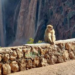 Kurz vor halb acht wurden wir abgeholt und fuhren zu den Ouzoud-Wasserfällen, den größten und bekanntesten Wasserfällen Marokkos. Bereits während der Fahrt machte uns der Reiseleiter auf zwei Dinge aufmerksam: auf die dort lebenden Berberaffen, die gerne nach Futter betteln, und auf die Verkäufer, die Erdnüsse anbieten, um die Affen anzulocken. Katrin war anfangs etwas besorgt, doch zum Glück bestätigten sich ihre Ängste nicht.