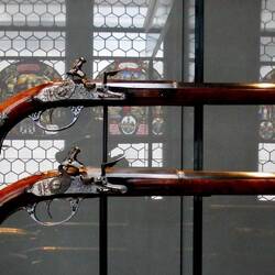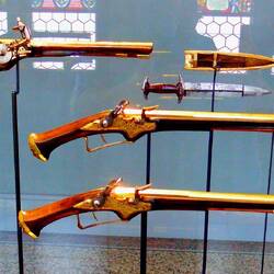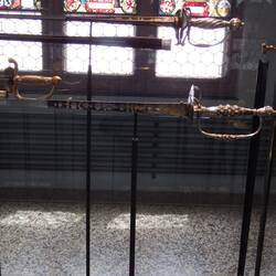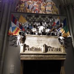 Moving into the Middle Ages, we are presented with an ornate hallway, a series of stained glass windows, and a small armory.