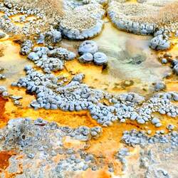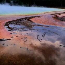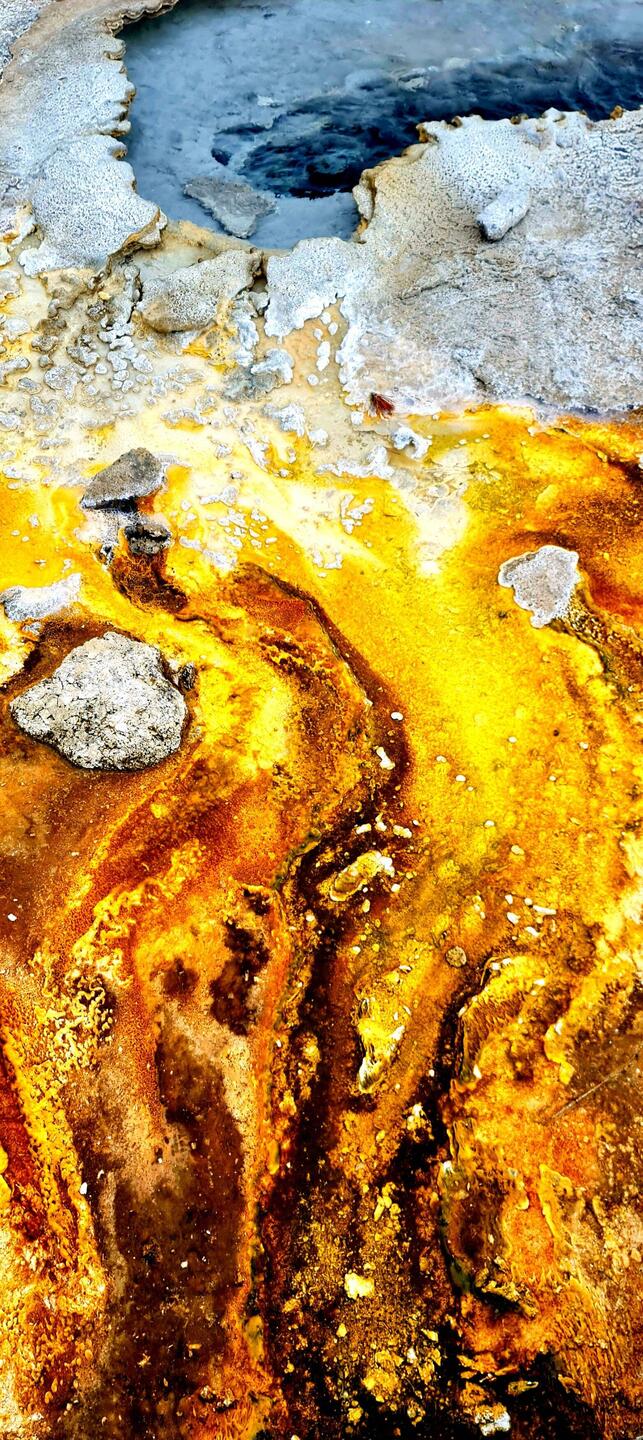 Hier beschlossen wir den weiteren Verlauf der Route, um noch alle für uns interessanten Sehenswürdigkeiten zu besuchen. Man könnte im Park 3 Wochen Zeit verbringen und hätte nicht alles gesehen. So fuhren wir zum West Thump. Unterwegs war plötzlich Stau. Als wir näher kamen, sahen wir den Grund. Ein Grizzly spazierte auf der anderen Flusseite entlang. So cool. Danach fuhren wir nördlich bis zum Old Faithful. Dieser grösste Geysir im Park bricht alle 90min aus. Zuerst schauten wir uns das riesige Faithful Inn an. Sehr beeindruckend. Danach machten wir uns auf die diversen Trails, die uns auf Holzstegen zu den verschieden, farbigen Kochtöpfen, Basins und Wasserlöchern führten. Stehts begleitet vom schweflichen Düftchen🤣
