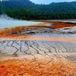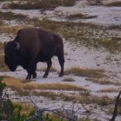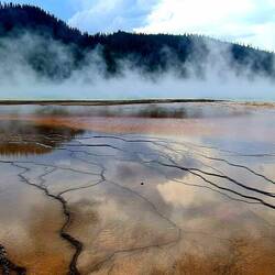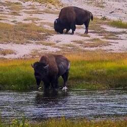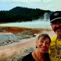 Da wir noch 1 Stunde hätten warten müssen, bis der Old Faithful seinen Hintern bewegte, fuhren wir zur letzten Station für uns. Der Grand Prismatic Spring Overlook. Unterwegs wieder Stau, alle suchten eine Parkmöglichkeit und schnappten ihre Handys. Der Grund waren 3 riesige Bisons im und am Fluss. Die Selphi Junkys hatten ihre liebe Mühe, ohne Gefahr möglichst nahe heran zu kommen. 😡. Die Parkplätze am Prisma Lake waren wieder Mangelware. Gut können wir stehts aussuchen, ob wir bei den RV's oder bei den PW's parken wollen. Je nachdem, was frei ist, sind wir das Eine oder das Andere🤣.