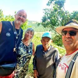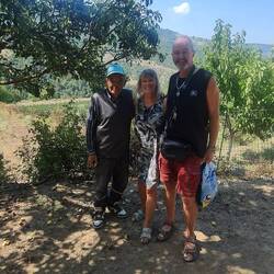 Als wir so gemütlich beim Kaffee sassen, hielt ein Auto. Der Fshrer stellte sich als Ismael aus Kurdistan vor. Er will hier eine Obstplantage bauen und er lud uns zum Tee ein. Nach 5km den Berg hinauf über Offroad-Strässchen waren wir dort. Es gab Tee, viel zu reden mit Google-Translater und zum Abschluss noch einen Ausflug in seine Obstplantagen. Dort wurden unsere Plastiksäcke mit Zwetschgen, Birnen Reineclauden gefüllt. Super lieb.🙏