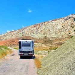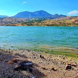 Auf der D-100 gings östlich durch ein wunderschönes Gebiet mit speziell farbigen Bergen und Hügeln. Beim Stausee Camlica Baraji angekommen konnten wir an einem Brunnen unsere Trinkwasser-Vorräte auffüllen, bevor wir kurz danach an unseren wunderschönen Stellplatz direkt am See ankamen.