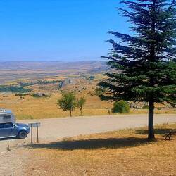 Um 10 Uhr spazierten wir bei noch angenehmen Temp. zum Basar. Wir waren fast die ersten Besucher. Mal was anderes. Es ging durch die Markthalle mit Gemüse, Fleisch und Fisch, durch die anderen Stände links, recht und kreuzquer. Um 11.30 uhr hatten wir genug und fuhren weiter. Wir fuhren östlich bis kurz vor Hattusas. Unterwegs hatten wir Temp. von 40 Grad. Dort fanden wir in abgeernteten Feldern im Schatten von grossen Pappeln einen coolen Stellplatz. Der Bauer meinte, dass wir überall stehen können, wo wir wollen. Im Camper hatten Temp. von 43 Grad. Es folgt eine Durchlüftungs-Aktion. Während dessen geniessen wir draussen im Schatten bei einem angenehmen Lüftchen einen Apero. Um 21.00 uhr ist schon dunkel.Read more