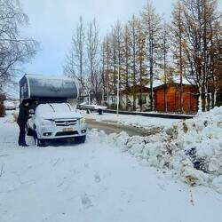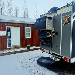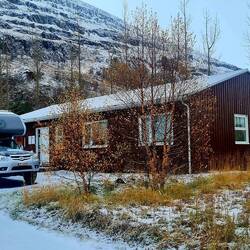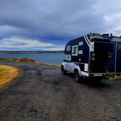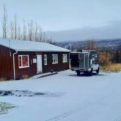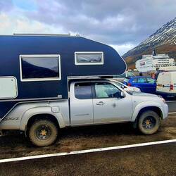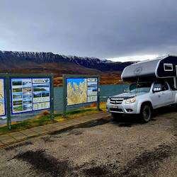 Traveler11. - 16. Oktober Hengifoss Camping Die Sturm- und Schneepause am 11.10 nutzten wir, um von Reykjahlid nach Egilstadir zu fahren. Zumal die Strassen wieder geöffnet waren. Diese Fahrt war recht abenteuerlich mit Orkanboen und eisigen strassen. Kurz abgedriftet☹ In Egilstadir war es wieder grün😊 Nach einem Einkauf in Bonus fuhren wir den See entlang zum Hengi Foss Campingplatz. Dort war eine beheizte Küche mit WC und Dusche. Alles im Preis von 3600 ISK . Dort blieben wir bis Montag, den 16.10, so konnten wir die Zeit bequem und warm aussitzen. Ab und zu bekamen wir Besuch, meistens abends, ansonsten hatten wir alles für uns. Über Nacht liessen wir die Standheizung auf Stufe 1 durch laufen, so hatten wir 15 Grad. Am 13.10 hatte HPF Geburtstag. Der fiel durch die Umstände etwas bescheiden aus. Dafür mit Lachs Apero (1. Und einziger auf Island) Wir hatten zwischendurch Gelegenheit die Batterien zu laden, (auch unsere). Wir hatten es warm, waren sicher und die letzte Woche auf Island konnten wir in Ruhe die ganze Reise setzen lassen.