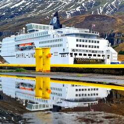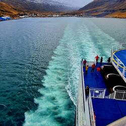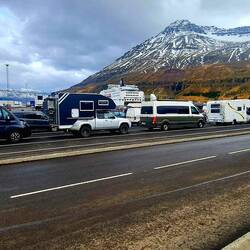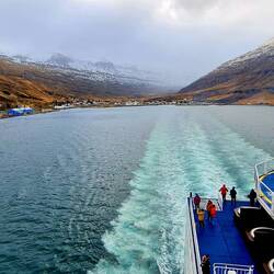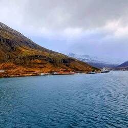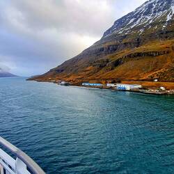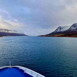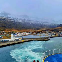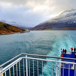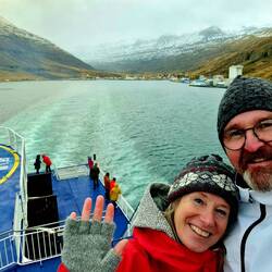 Traveler17./18. Oktober Schluss der Island- Reise Nach einer Nacht Verlängerung vom 16.10 auf den 17.10 fuhren wir endlich los, nach Egilstadir und schliesslich nach Seydisfjördur. Dort suchten und fanden wir ausserhalb einen Übernachtungsplatz. Auf dem Pass hatten wir nochmals Schnee, jedoch kein Problem. Jedoch waren wir froh und dankbar heil angekommen zu sein. Nun dauerte es nicht mehr lange 😊 Wir waren sehr froh, die 14 Tage frühere Fähre nehmen zu können, dass die Umbuchung geklappt hat. Was hätten wir nur dieser Zeit gemacht? Am 18.10 am Morgen waren wir schön früher wach und fuhren in die Nähe des Check-in Schalter. Dort frühstückten wir. Um 09:30 Uhr ging es los. Dies auch schon 7 Std. früher als geplant wegen Wetterkapriolen. Um 13:00 Uhr legte die Fähre ab, im Fjord war es noch ruhig, danach wurde es immer stürmischer. Es hatte nur wenige Passagiere an Bord. Beim Nachtessen wurde HPF immer bleicher und mit essen war nichts mehr. Der Abend verbrachten wir in der Kabine. HPF mit Seekrankpille😊