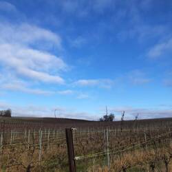 Die Fahrt geht über die Autobahn an Weinbergen vorbei. Die GegendOkumaya devam et