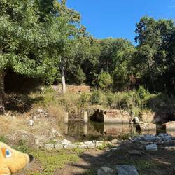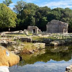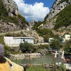 Zunächst führte die Tour am Fluss entlang. Dort sahen wir zum ersten Mal aus der Nähe einen der vielen in Albanien stehenden Ein-Mann-Bunker. Sie haben heute keine Bedeutung mehr, aber ein Abriss ist wahrscheinlich zu aufwändig. So lässt man sie einfach verfallen.