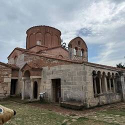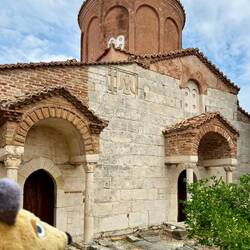 Herzstück der Anlage ist die alte Kirche, in der der heilige Naum beerdigt ist. Legt man den Kopf auf seine Grabplatte, kann man angeblich noch den Herzschlag des Heiligen hören. Weniger romantisch veranlagte Menschen verweisen allerdings auf die Wellengeräusche des Ohridsees, die diese Töne hervorbringen sollen. Die Kirche selbst ist mit alten Fresken bunt ausgemalt, die zum Teil knapp 1000 Jahre alt sind. Von der Terrasse neben der Kirche hatten wir einen wunderschönen Blick über den gesamten See bis nach Ohrid. Nach der Besichtigung der Kirche schlenderten wir durch den Park, welcher zu dieser Anlage gehört. Da hier unzählige Quellen entspringen, hätten wir auch mit einem der Ruderboote eine kleine geführte Bootstour unternehmen können. Darauf hatten wir allerdings keine Lust, genauso wenig wie auf die Verkaufsstände mit jeder Menge Kitsch.