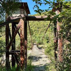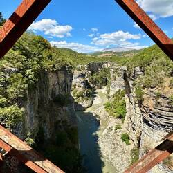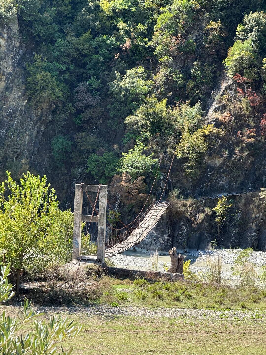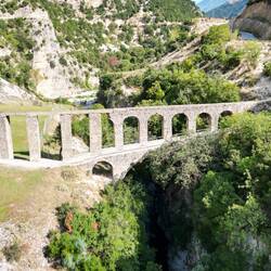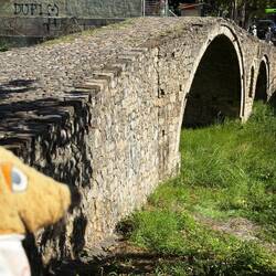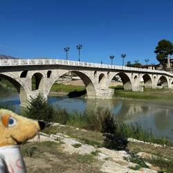Frisch gestärkt, erreichten wir das Sushica-Tal und fuhren in diesem Richtung Norden. Die Straße war gut ausgebaut und so kamen wir flott vorwärts. In Brataj legten wir eine längere Pause ein, da wir etwa 100 m zu der ausgeschilderten Bogenbrücke absteigen mussten. Für diesen Abstieg gab es eigentlich keinen Weg. Vielmehr kletterten wir über Geröll in die Tiefe, bis wir die alte Brücke erreicht hatten. Dank unserer Drohne konnten wir Fotos machen, ohne über Felsen in den Fluss klettern zu müssen.
