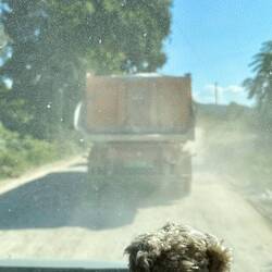 In einem Fernsehbeitrag hatten wir einen Bericht über den Bovilla-See gesehen. Da uns die Bilder gefallen hatten, fuhren wir zunächst dorthin. Wir wunderten uns zwar, dass unser Navigationssystem keine Strecke dorthin fand. Als wir noch etwa 10 km von diesem See entfernt waren, wussten wir, warum: Die Straße wandelte sich in einen staubigen Feldweg mit großen Schlaglöchern. Wir kamen nur im Schneckentempo vorwärts. Zudem waren auf dieser Strecke Kieslaster unterwegs, was unsere Fahrt nicht gerade vereinfachte.
