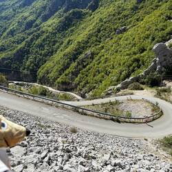 Nachdem wir unsere Vorräte aufgefüllt hatten, fuhren wir Richtung Süden aus Korçë hinaus. Ein paar Kilometer hinter der Stadt begann die neugebaute breite Straße. Wir entschieden uns aber, die alte kurvenreiche Strecke zu fahren, auch wenn diese viele Schlaglöcher hatte. Wir versprachen uns davon aufgrund des schwachen Verkehrs mehr Möglichkeiten, unterwegs anzuhalten.