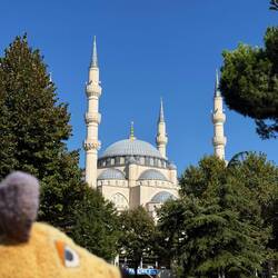 Unsere Besichtigung starteten wir bei der alten Gerberbrücke. Diese steht mitten in der Stadt, weshalb es etwas schwierig war, ein vernünftiges Foto davon zu machen. Anschließend gingen wir zur Namazgah Moschee. Diese ist noch relativ neu und innen prächtig in Blautönen ausgeschmückt. Frauen und Männer müssen gesonderte Eingänge benutzen. Für Frauen bedeutet dies, dass sie oben auf der Empore bleiben müssen. Für uns war das in Ordnung, da wir so Bilder aus verschiedenen Blickwinkeln machen konnten.