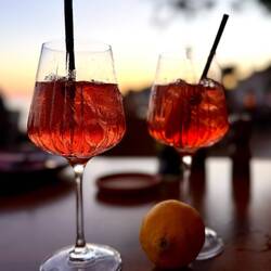 Wie von unserem Wetterfrosch vorhergesagt, begann es gegen 16:00 Uhr zu gewittern. Wir gingen deshalb in eine Bar an der Uferpromenade. Leider wurde der Regen immer stärker, weshalb wir über eine Stunde dort abwarteten. Als der Regen eine kurze Pause machte, gingen wir weiter durch die Stadt. Bald schon begann es, erneut zu regnen. Wir „flüchteten“ schnell in ein Weinrestaurant auf die überdachte Terrasse und begossen unseren heutigen 20. Hochzeitstag mit einem Sekt.
