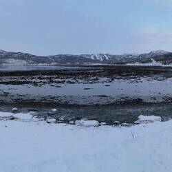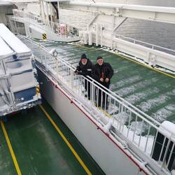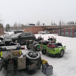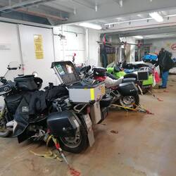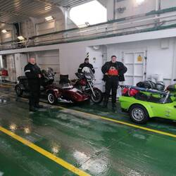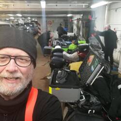 EreignisreicherTag. Bei 0° vom Gästehaus losgefahren. Mussten pünktlich sein, weil wir die Fähre erwischen mussten. Für ein Foto mal eben in einer Pannen sucht anhalten und zack, festgefahren. Foto gab's auch nicht, Werner drängeln, nur noch 8 Minuten bis zur Fähre. Also schieben und los. Andreas ging es genauso. Fähre haben wir rechtzeitig angesteuert.