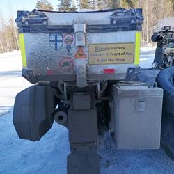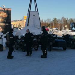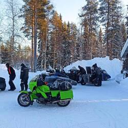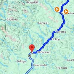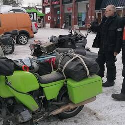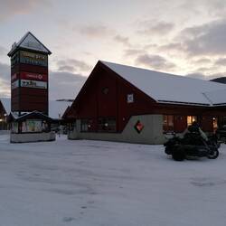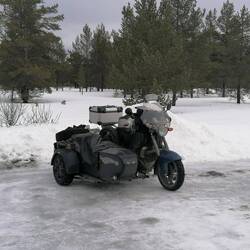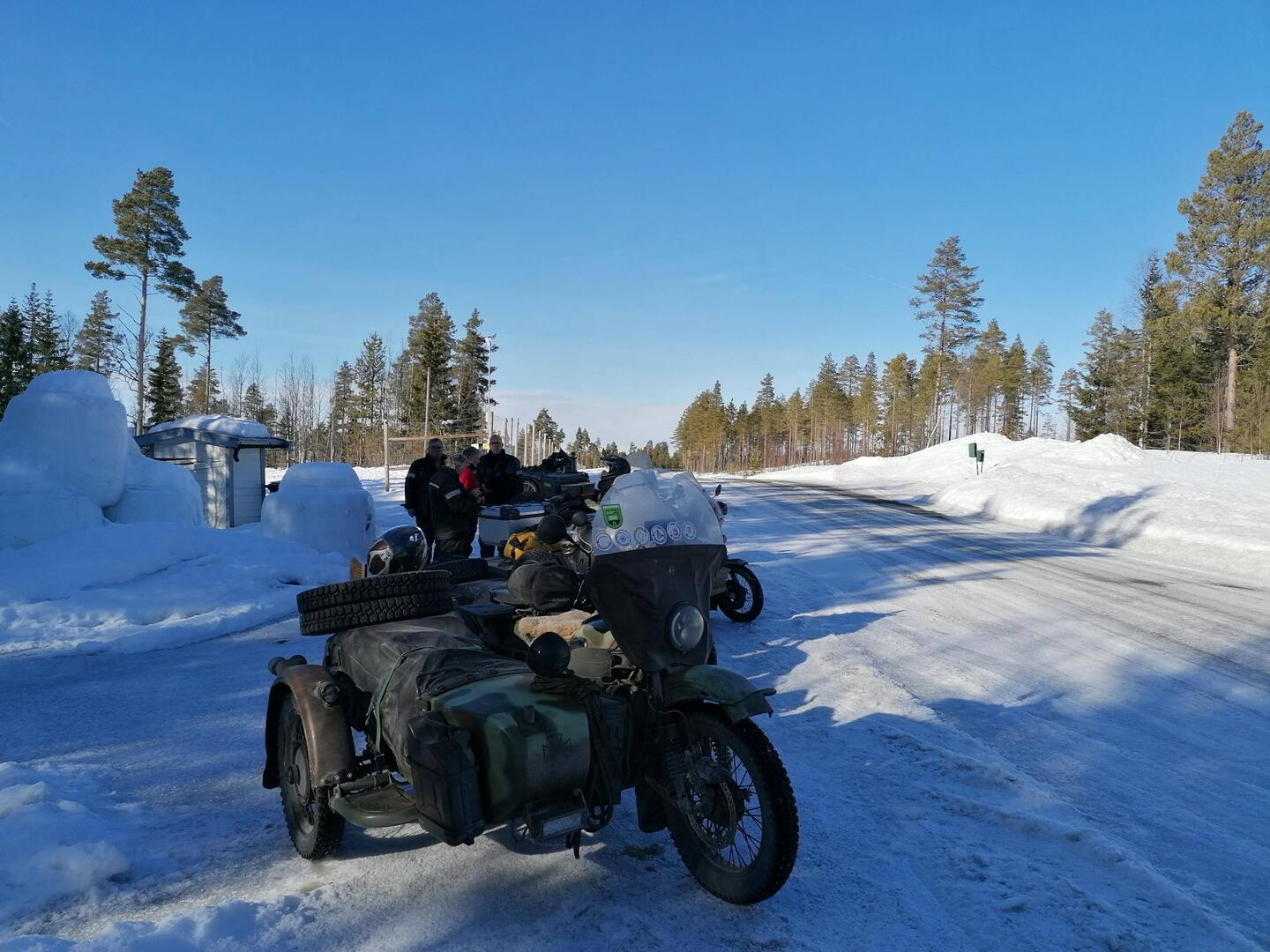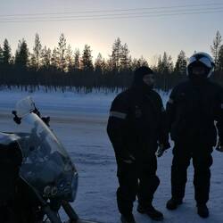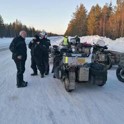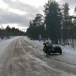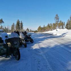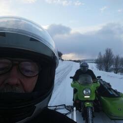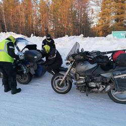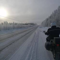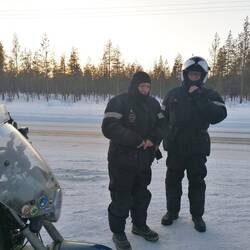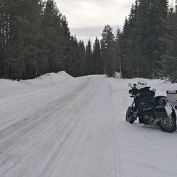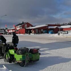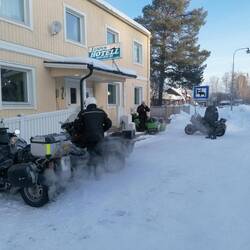 Die Nacht in Storuman war kalt. 300m zum Restaurant und schon kalte Ohren. Pünktlich um 09 Uhr sind wir los. Erst mal tanken, dann weiter die E45 runter Richtung Östersund. 310 km stehen heute auf dem Navi. In Strömsund einen kleinen Schlenker über eine "schönere" Straße. Im Ort erst mal tanken, nicht nur Sprit, auch Wärme durch Kaffee. Brr.. Echt kalt heute. Werner hat sogar die Heizsocken ausgepackt und angeschlossen. Andreas hat Probleme mit seiner Verkabelung für die Heizausstattung. Müssen öfter mal ne 2 Minuten Pause einlegen, um das Visier vom Eis zu befreien.