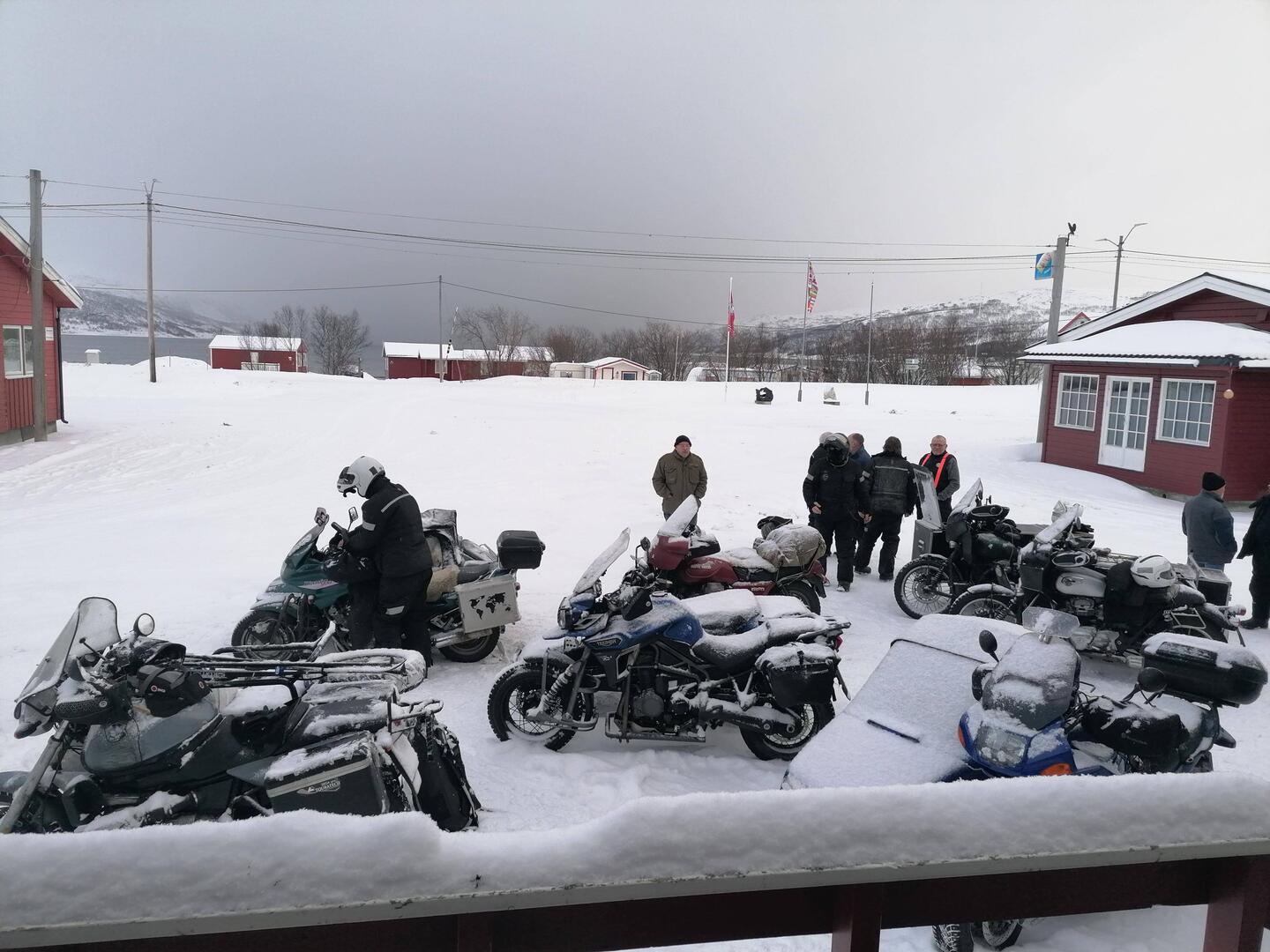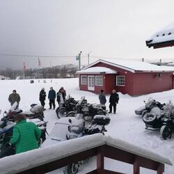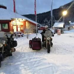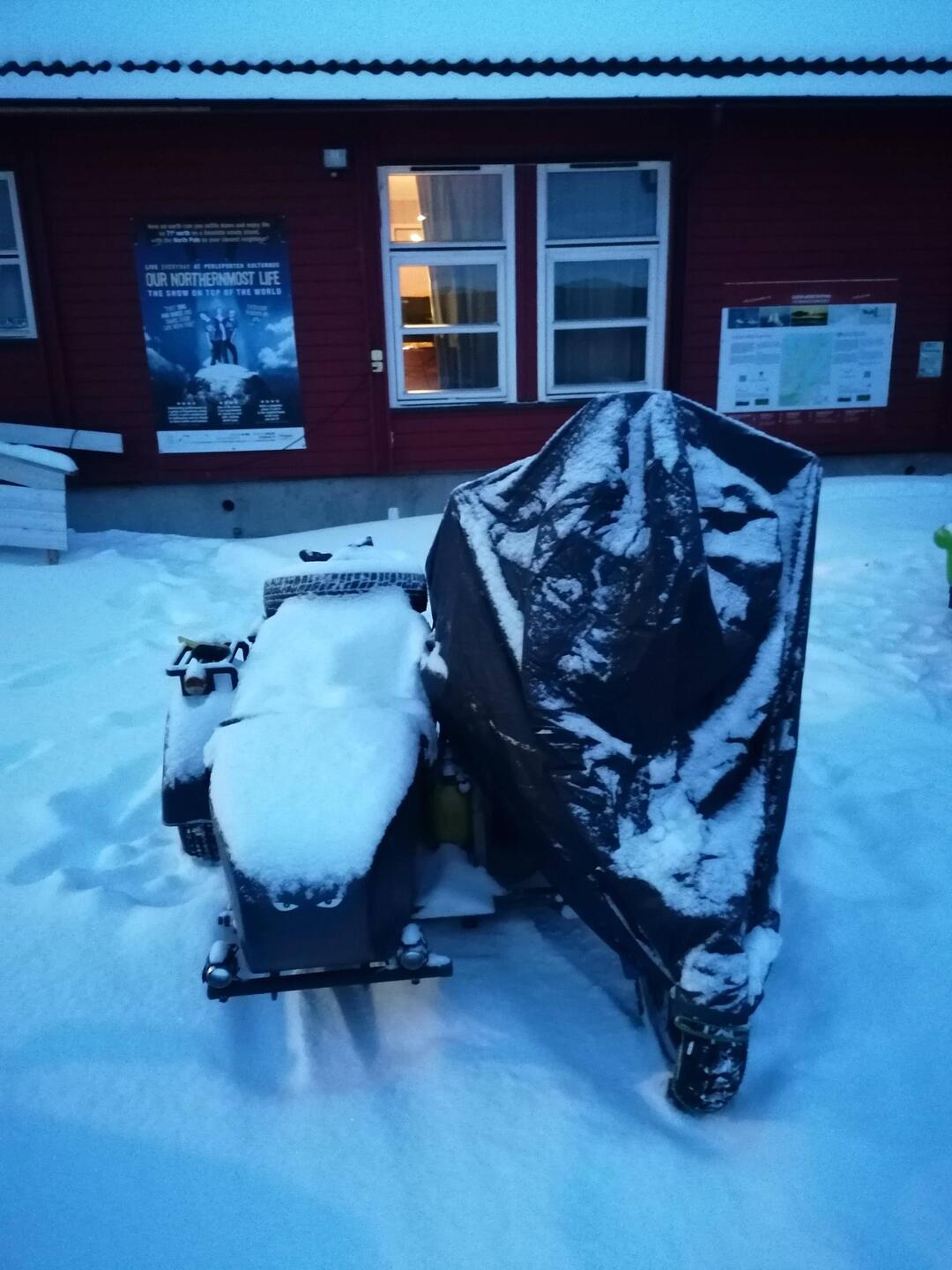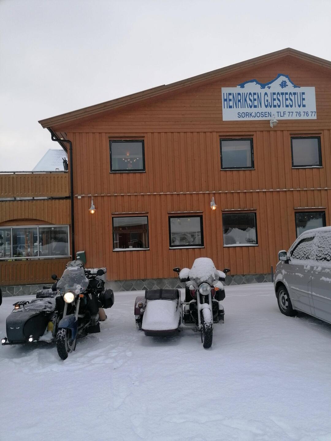Heute den ersten Pölser gegessen. Nix anderes als ein sündhaft teurer Hot-Dog.😉 Die weitere Fahrt an der Nordmeerküste entlang fand ich sehr spannend. Die verschiedensten Einflüsse von Tageslicht auf die Umgebung schon unbeschreiblich. Schließlich noch heftiger Schneefall rundet das Bild ab. Sicher erreichten wir auch dieses Etappenziel. Hier ist der Treffpunkt des nördlichsten Motorrad Treffens Deutschlands. 13 Gespanne, 2 PKW ausser Konkurrenz aufgrund einer Wette in Bierlaune.