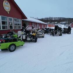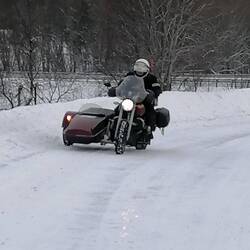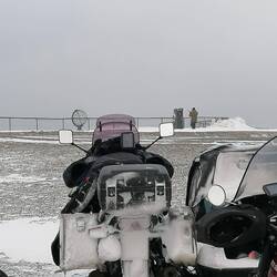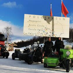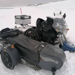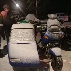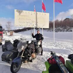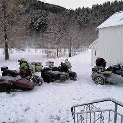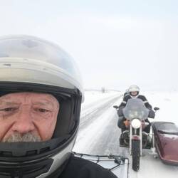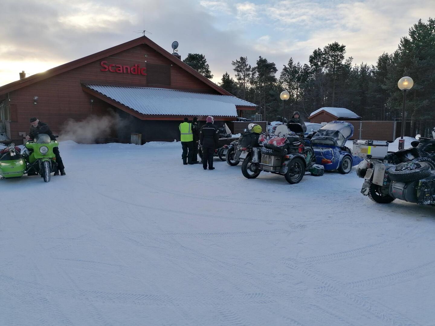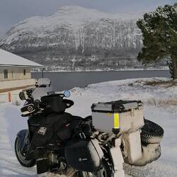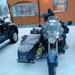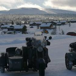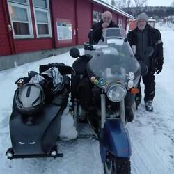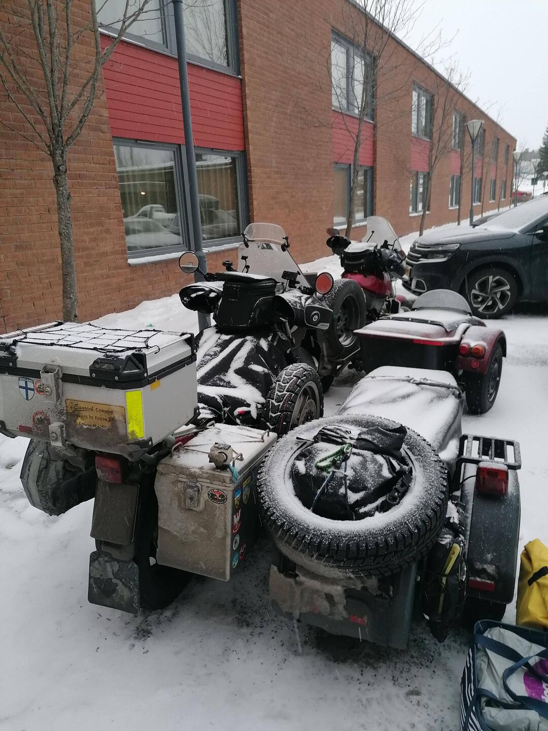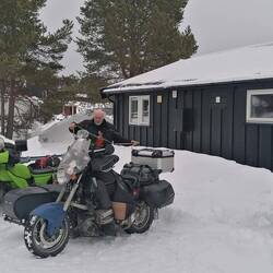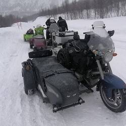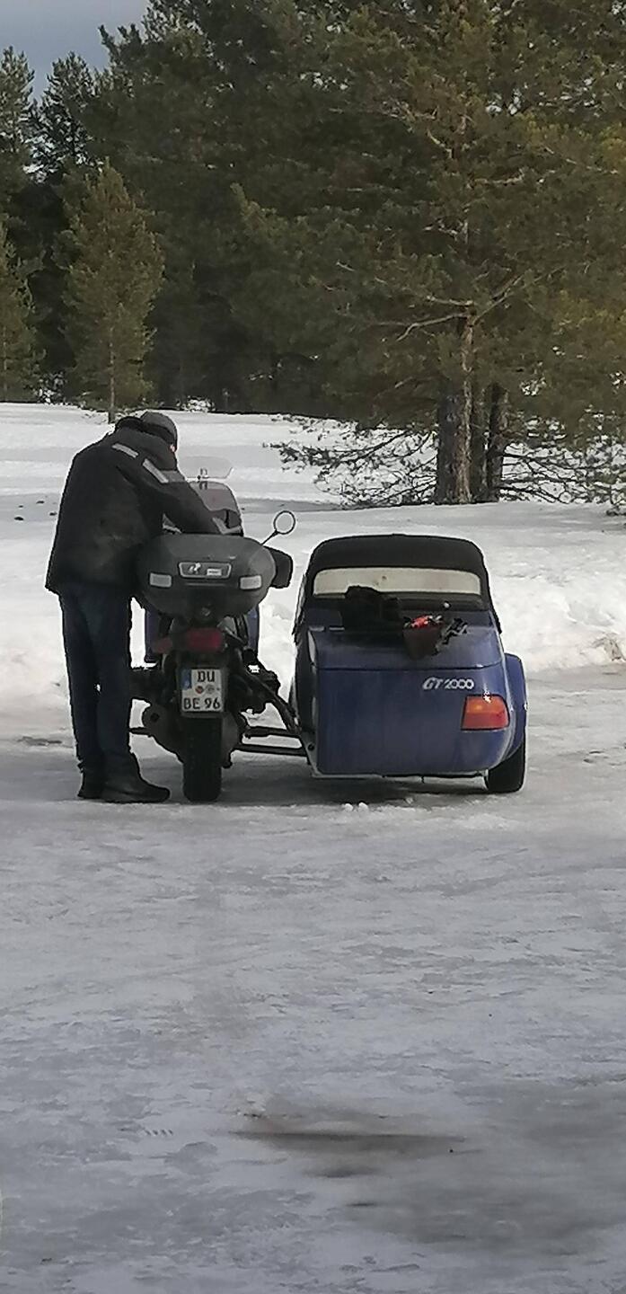 Heute den ersten Pölser gegessen. Nix anderes als ein sündhaft teurer Hot-Dog.😉 Die weitere Fahrt an der Nordmeerküste entlang fand ich sehr spannend. Die verschiedensten Einflüsse von Tageslicht auf die Umgebung schon unbeschreiblich. Schließlich noch heftiger Schneefall rundet das Bild ab. Sicher erreichten wir auch dieses Etappenziel. Hier ist der Treffpunkt des nördlichsten Motorrad Treffens Deutschlands. 13 Gespanne, 2 PKW ausser Konkurrenz aufgrund einer Wette in Bierlaune.